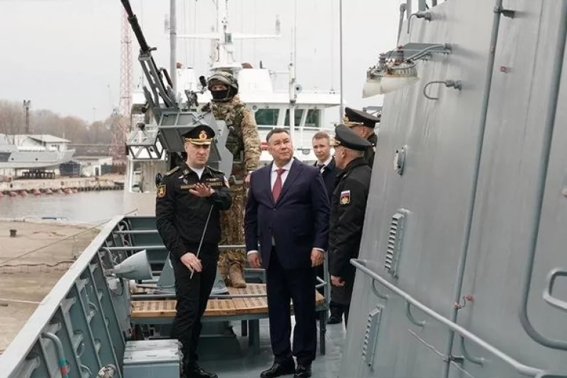 В рамках визита Игорь Руденя осмотрел ракетный корабль «Наро-Фоминск», который несет службу в составе Балтийского флота. Корабль выполняет задачи по обеспечению безопасности судоходства в акватории Балтийского моря и оснащен современными видами вооружений. Полпред пообщался с экипажем, а также ознакомился с условиями службы и быта моряков.